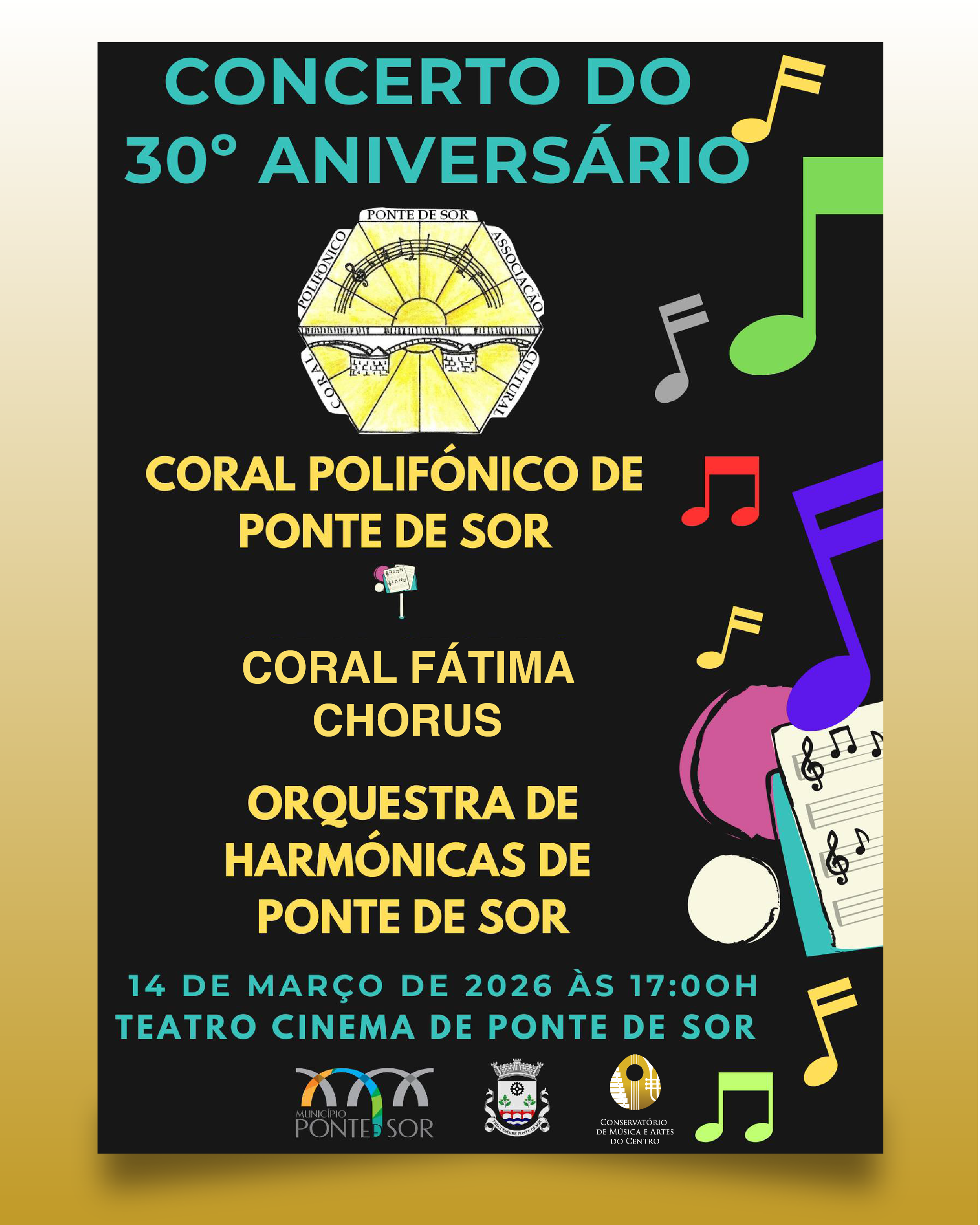 Agradecemos o convite e felicitamos o Coral Polifónico de Ponte de Sor por três décadas de dedicação à música e à cultura.