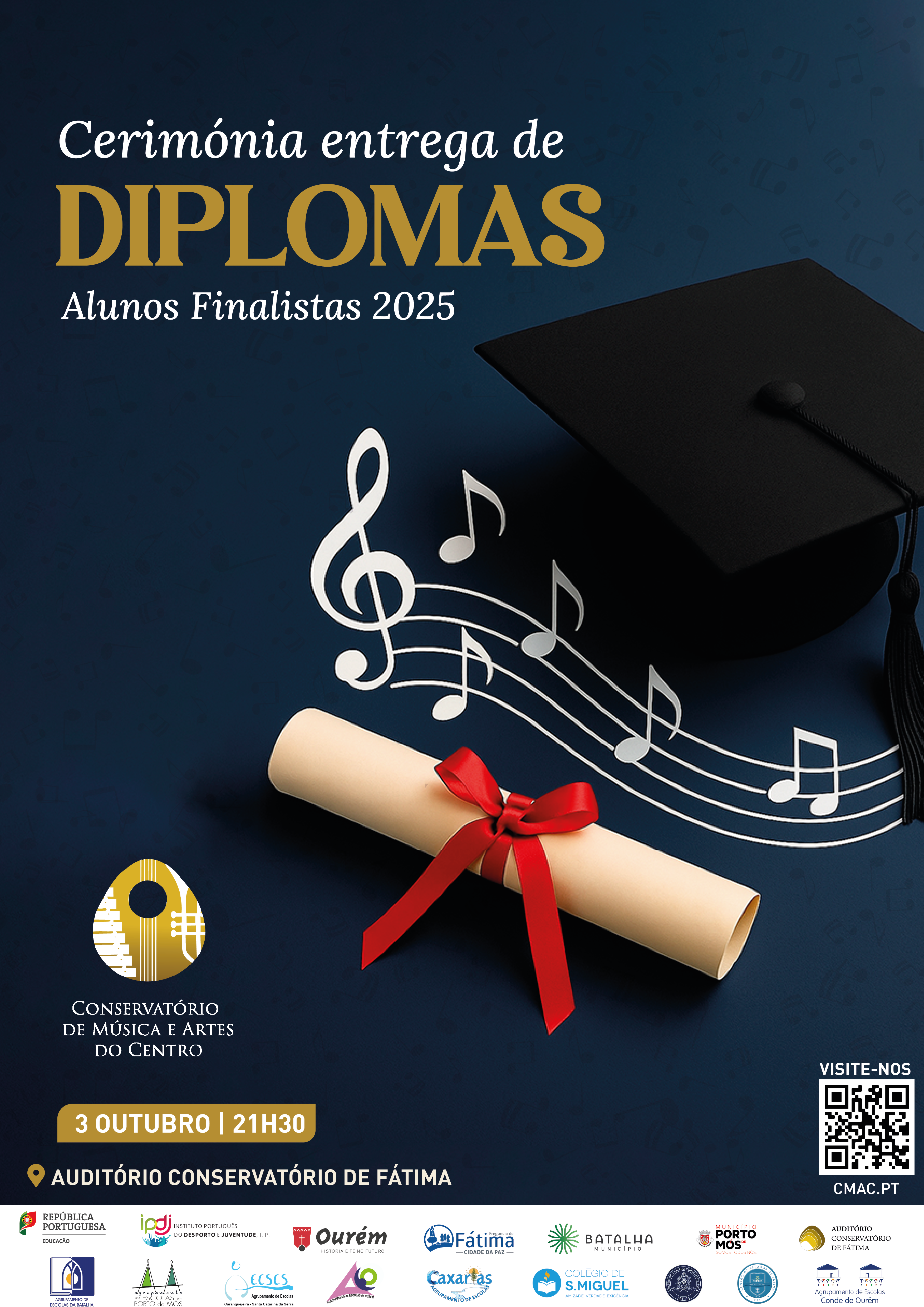No dia 3 de outubro realizar-se-a a entrega dos diplomas aos alunos finalistas do CMAC, ; Convidamos alunos, encarregados de educação e familiares para celebrar o percurso e a dedicação destes alunos, que concluíram com êxito 5 anos de estudo no Regime Articulado do Conservatório de Música e Artes do Centro.